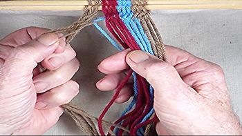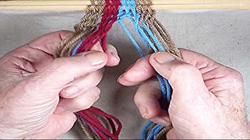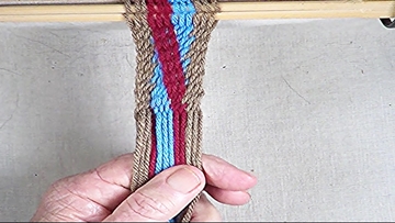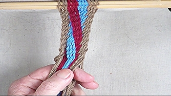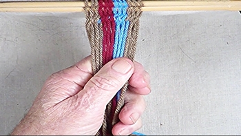 Reach through the shed of the twinning strands and pick up the first top strand of the right hand color band. Pass the picked up strand through the shed of the twining strands. |