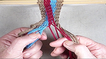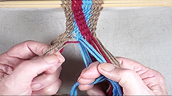 Reach throught the she of the twinning strands. Pick up the next top strand of the right hand color band. Pass the picked up strand through the shed of the twining strands. |
