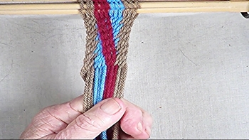 Weave the second pass of the third section of the [Z] twist interlinked diagonal pattern. [OBSERVE] The color band strands have been returned to the original configuration. Continue adding additional passes of [Z] twist interlinked fingerwewaving until the workpiece has reached the desired length. |